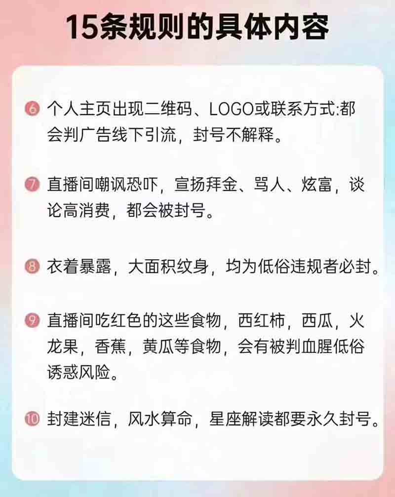4.管制刀具、違禁品,敏感話題直接下播,重則封號(hào)。