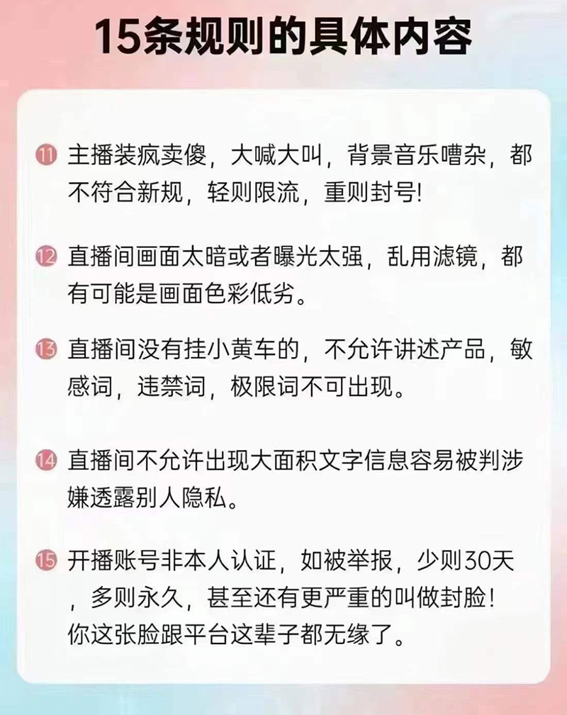 11.主播裝瘋賣傻,大喊大叫,背景音樂(lè)嘈雜,都不符合新規(guī),輕則限流,重則封號(hào)!