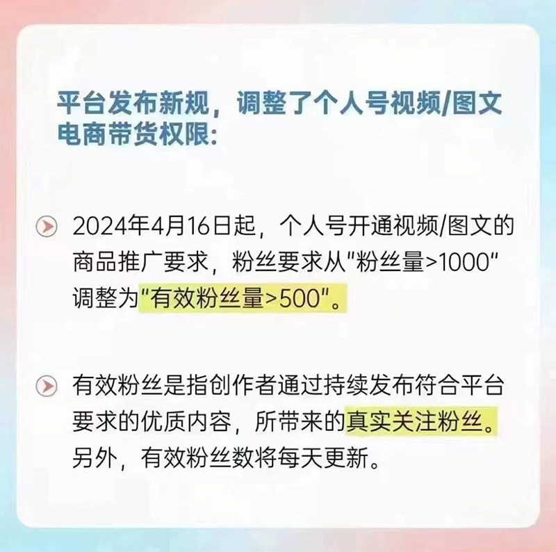 2024年4月16日起,個(gè)人號(hào)開(kāi)通視頻/圖文的商品推廣要求,粉絲要求從“粉絲量>1000”調(diào)整為"有效粉絲量>500"。